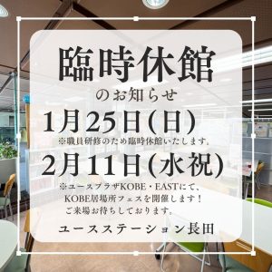 ユースステーション長田は、 12月28日(日)から1月4日(日)まで休館いたします。 年明けは1月5日(月)10:00~20:00で開館いたします。 1月7日(水)より通常通り平日14:00~土日祝10:00~ &nbs […]